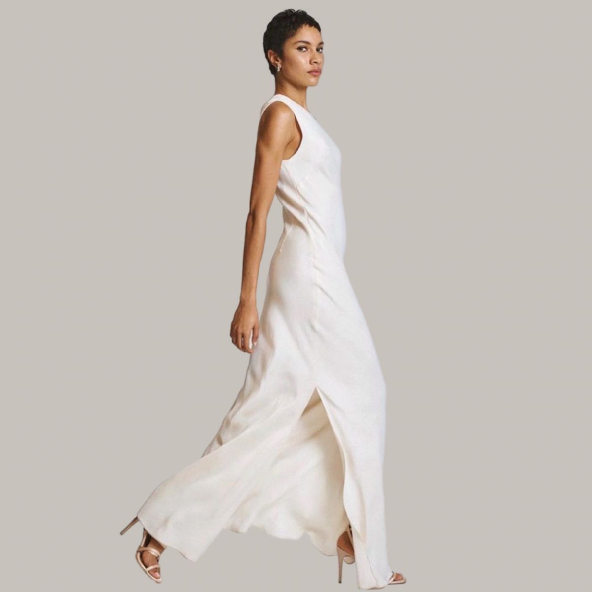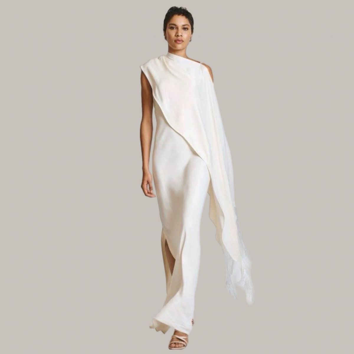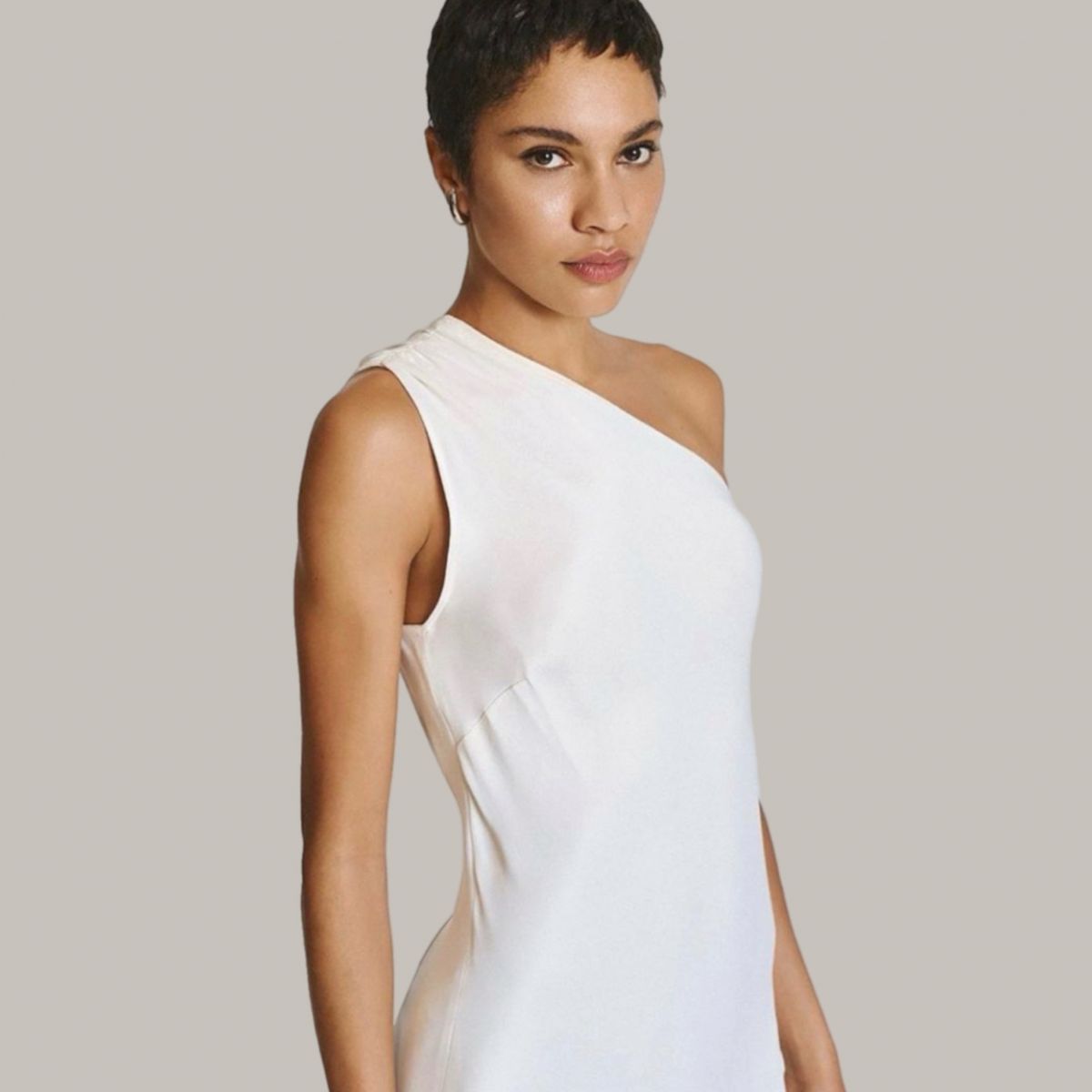 Elegante e scenografico, questo maxi abito in viscosa conquista con la sua finitura satinata luminosa e il sofisticato design monospalla. La linea fluida valorizza la silhouette, mentre lo spacco laterale aggiunge movimento e sensualità ad ogni passo.
